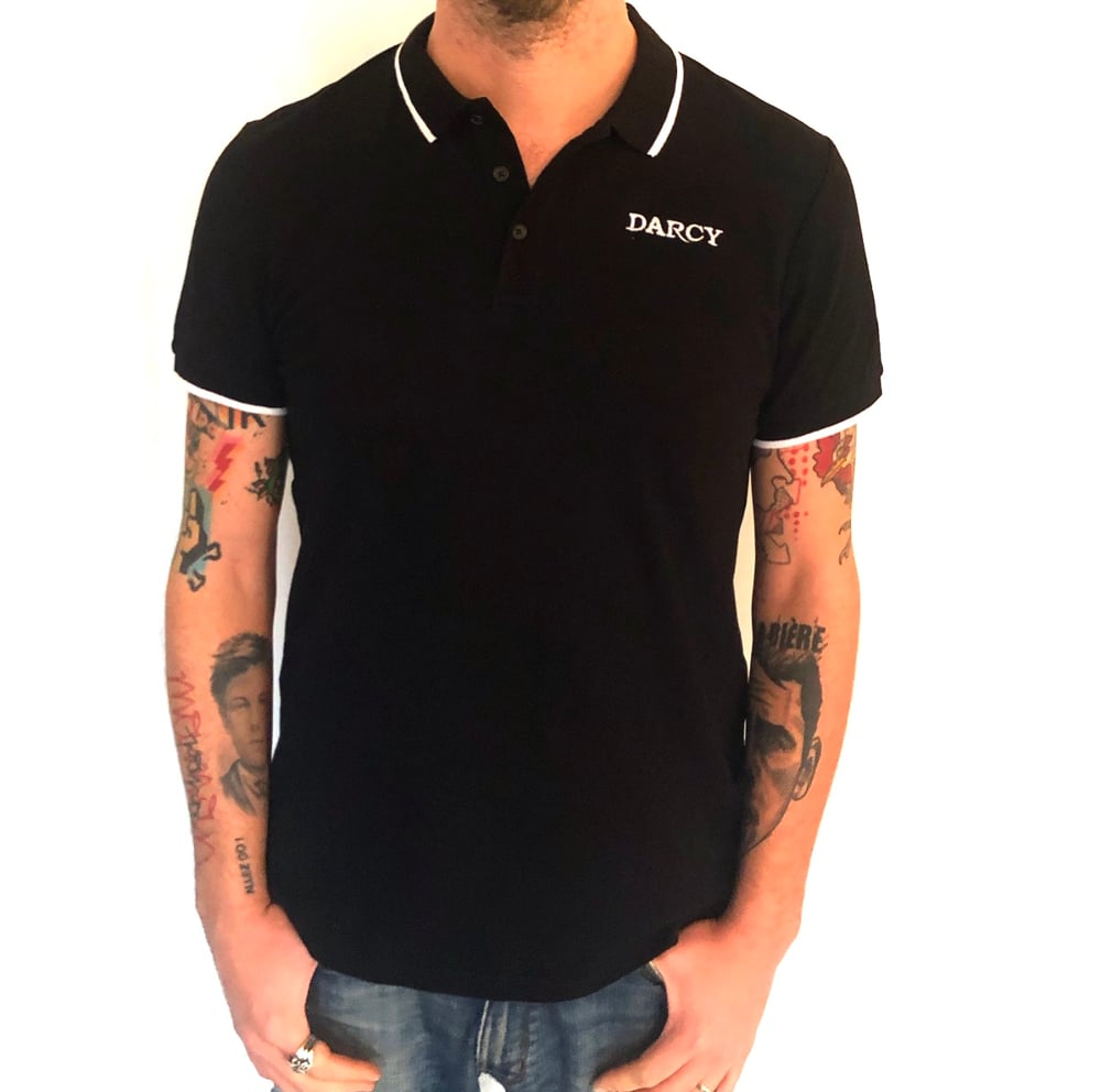 Polo noir avec logo "Darcy" brodé en blanc.